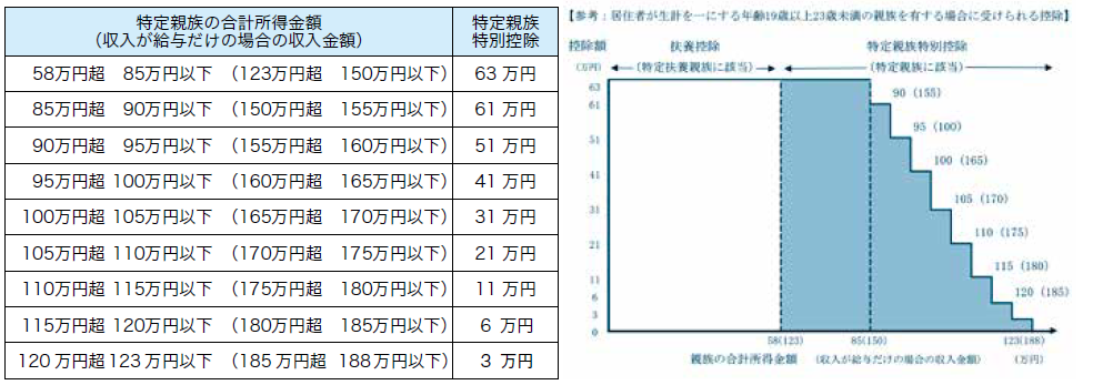 ・居住者が特定親族を有する場合、特定親族の合計所得金額に応じて次の金額を控除する特定親族特別控除が創設