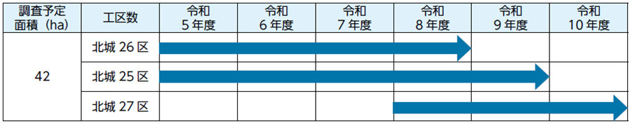 令和5年度から北城25・26区として大出地区の調査を実施しています。令和6年1月1日に発生した能登半島地震の影響により基準点が移動したため調査を一時中断しましたが、令和7年10月から、地権者の立会を再開します。
