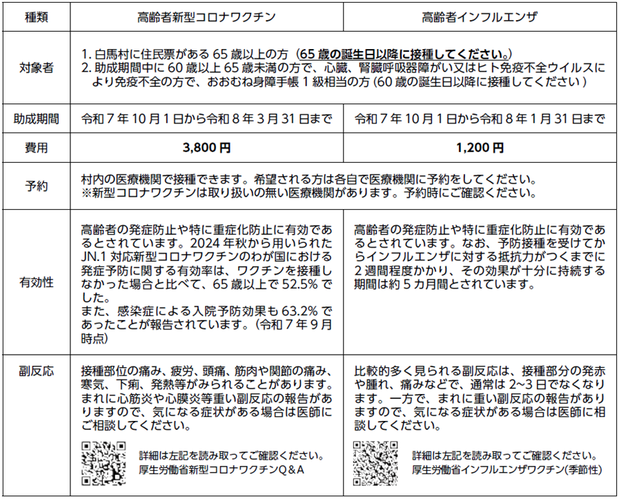 白馬村では10月より下記の定期接種(B類疾病)の補助を実施しています。予防接種には感染症の予防効果とともに、副反応のリスクがあります。参照いただき、ご理解いただいたうえで接種をご検討ください。