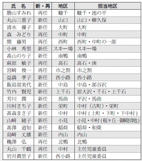 12月1日、民生委員・児童委員の委嘱書交付式が行われました。各地区の担当民生委員・児童委員は下表のとおりです。