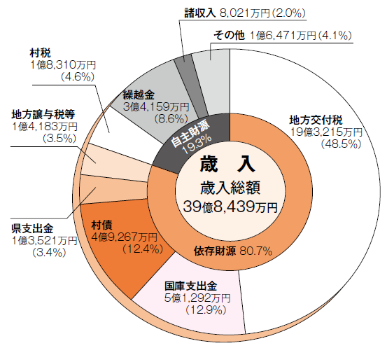 歳入全体に占める村税などの自主財源は19.3%で、残り80.7%が、国や県から交付される依存財源となっています。