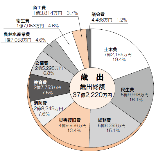 公営住宅建設や村道維持補修、橋梁長寿命化事業、除雪事業などの土木費が19.4%、社会福祉、高齢者福祉が多くを占める民生費が16.1%、基金積立や地方創生事業、移住定住対策、村づくり、役場庁舎管理などの総務費が15.1%、災害復旧費が13.4%、消防費7.6%、小中学校運営、社会教育やスポーツ振興などの教育費が7.5%、借金返済にあたる公債費6.8%、農林水産業費及び健康診断、ゴミ処理などの衛生費が4.6%と続いています。