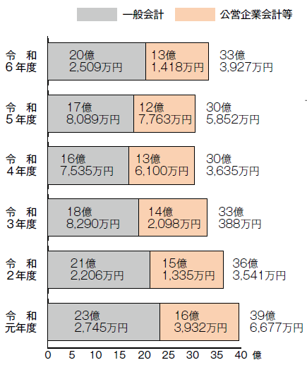 村債は、村営住宅建設事業で1億2,280万円、防災行政無線設備更新や防火水槽に1億4,990万円、災害復旧事業に8,420万円などにより4億9,267万円となりました。