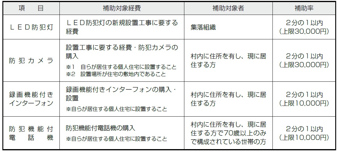村では、侵入犯罪、窃盗等を未然に防止するために、家庭用防犯カメラなどの防犯物品を購入・設置する方に対し、設置費用の一部を補助します。