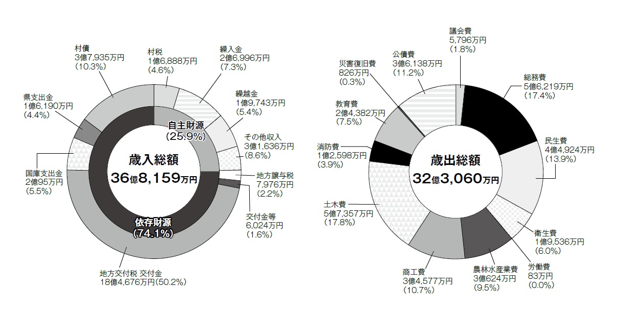 地方交付税交付金が18億4,676万円(対前年度比102.1%)で全体の約半分を占めています。国庫支出金は、2億95万円(対前年度比84.2%)、県支出金は、1億6,190万円(前年度比106.8%)、村債は3億7,935万円(対前年度比68.3%)となりました。