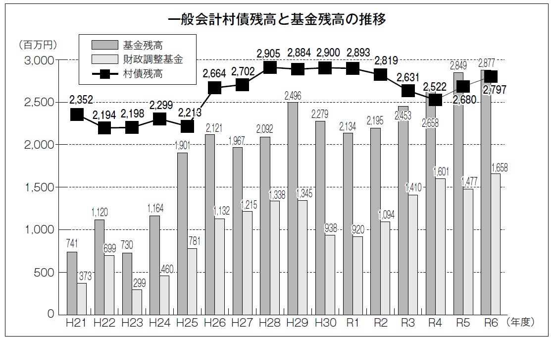 また、基金(貯金)の残高は、減債基金から2億円ほどの取り崩しを行っていますが、他の基金での積立を行えたため、総額で2,763万円ほど増加しました。(基金総額:28憶7,700万円)