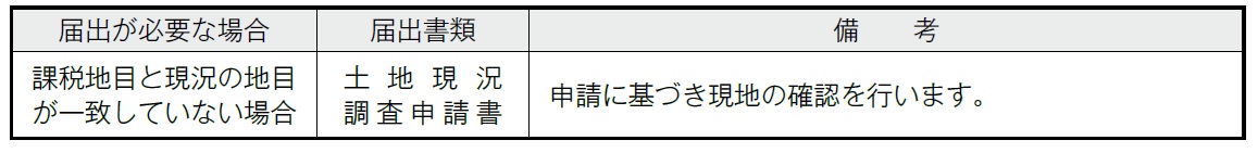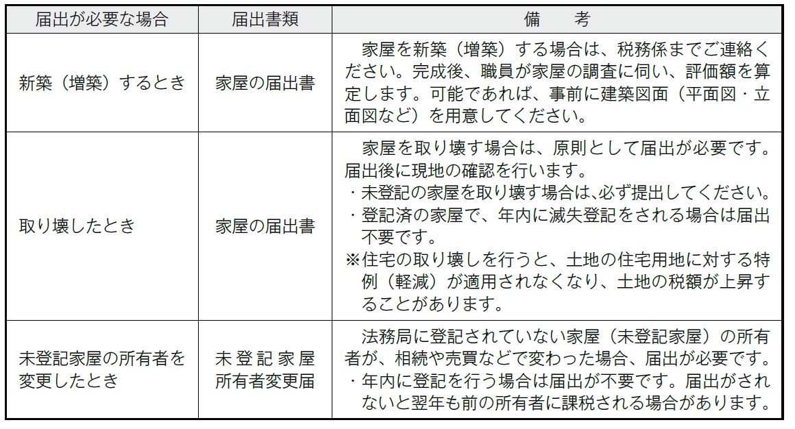 固定資産税を適正に課税するため、所有されている土地・家屋に異動があった場合には次のとおり届出・申請をお願いします。