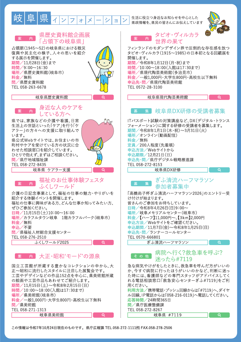 くらし 岐阜県インフォメーション 令和7年11月号 4/4 前の記事 発行日 : 2025年11月01日 自治体名 : 岐阜県 広報紙名 : 岐阜県からのお知らせ 令和7年11月1日号 Tweet シェアする その他のお知らせ(岐阜県からのお知らせ 令和7年11月1日号)