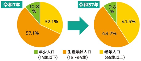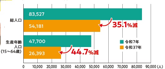 日本の人口は減少し続け、今後もさらに加速すると予想されています。関市の人口も例外ではなく、今年と30年後の人口将来予測を比較すると生産年齢人口は44.7%減少、総人口は35.1%減少する見込みです。円グラフから人口構成比も変わっていることが分かります。この円グラフは関市全域ですが、地域ごとで人口構成比は大きく変わります。