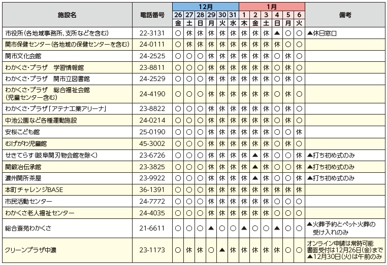 くらし 年末年始 市役所などの業務のご案内 4/33 前の記事 次の記事 発行日 : 2025年12月01日 自治体名 : 岐阜県関市 広報紙名 : 広報せき(Seki Gocoro) 令和7年12月号 年末年始の市役所や各施設の業務は次のとおりです。休業期間中の出生届や婚姻届、死亡届の受付などは市役所の守衛室で日直職員が行います。 ※詳細は各施設へお問い合わせください。 Tweet シェアする [巻頭特集] 地域のために 地域で育む 地域委員会(3) 年末年始ごみ収集