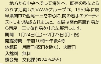 文化 今月のアートタイム 21/26 前の記事 次の記事 発行日 : 2026年01月01日 自治体名 : 岐阜県関市 広報紙名 : 広報せき(Seki Gocoro) 令和8年1月号 ■市役所7階展示室 ◆関市所蔵作品展III Tweet シェアする あんなこと こんなこと 市長とミライとーく