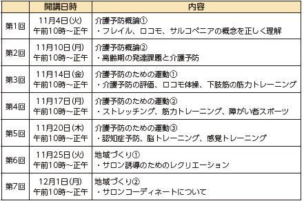 地域での介護予防活動(通いの場や体操教室など)に携わるための人材を育成する講座です。