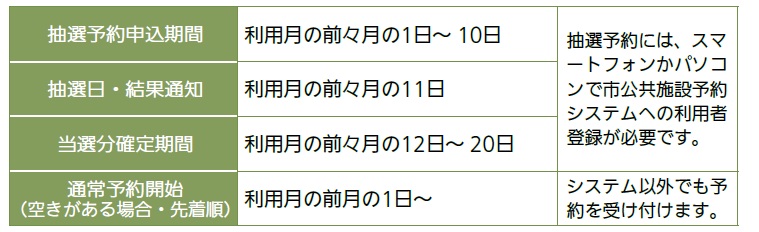 ※抽選は、曜日や施設休館日に関わらずシステムで行います。例えば、12月利用分(12月1日~31日)の抽選予約申し込みは10月1日~10日に行い、10月11日に結果を通知します
