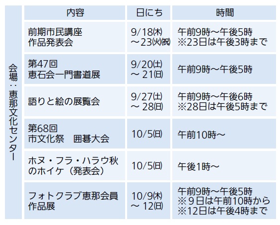 ※令和8年10月6日(火)~11月1日(日)の恵那文化センター大ホール・集会室・展示室の施設予約は、令和7年10月1日(水)午前9時から。重複の場合は利用者同士で調整を行い、調整が付かない場合は抽選で決定します。抽選は直接来館した方が対象です。
