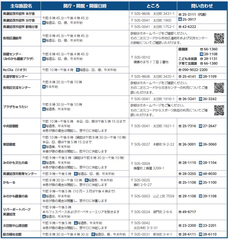 くらし 主な施設のご案内 45/50 前の記事 次の記事 発行日 : 2025年12月10日 自治体名 : 岐阜県美濃加茂市 広報紙名 : 広報minokamo 令和7年12月号 (年末年始の開庁日時などは本号12ページをご覧ください) ※いずれも市外局番は「0574」です ※振替休日は祝日として表記しています Tweet シェアする 今月の各種無料相談日 2025.12.10-2026.1.09(2) 美濃加茂市の動き
