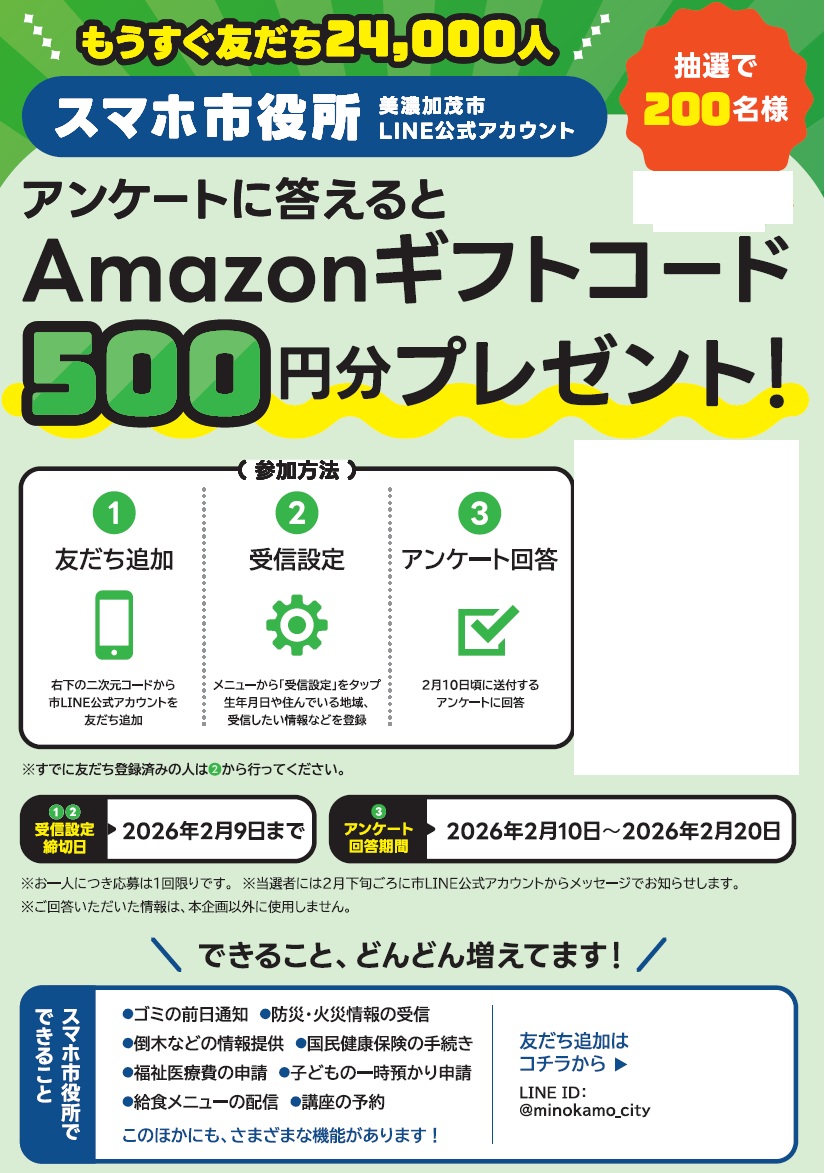 くらし スマホ市役所(市LINE公式アカウント) 2万人達成企画 36/37 前の記事 次の記事 発行日 : 2026年02月10日 自治体名 : 岐阜県美濃加茂市 広報紙名 : 広報minokamo 令和8年2月号 ※二次元コードは本紙をご覧ください。 Tweet シェアする 編集後記 その他のお知らせ(広報minokamo 令和8年2月号)