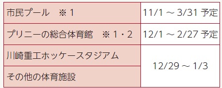 ※1 市民プールとプリニーの総合体育館は、工事のため長期間の休業です。
