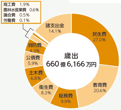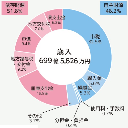 一般会計とは、福祉や教育、都市基盤の整備など、市の基本的な事業を行う会計です。令和6年度の歳入は、699億5826万円、歳出は660億6166万円でした。その内訳は下記のとおりです。