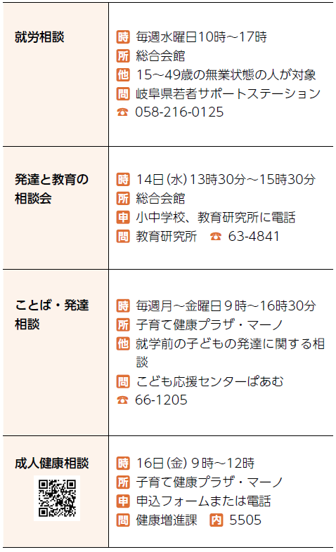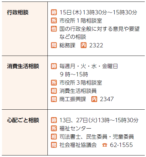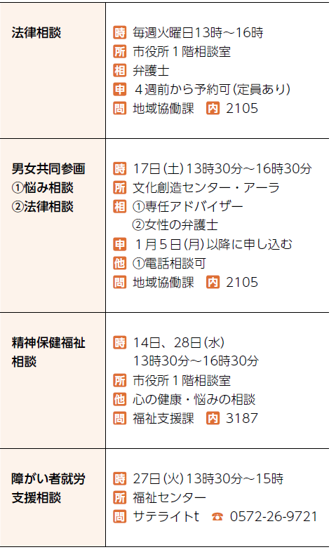 くらし 1月の無料相談 14/23 前の記事 次の記事 記事を読み上げる 発行日 : 2025年12月01日 自治体名 : 岐阜県可児市 広報紙名 : 広報かに 令和7年12月号 いずれの相談も祝日・振替休日・年末年始を除く ■申込が必要な相談 ■申込が不要な相談 申込が不要な相談先に相談者がいる場合、待ち時間が発生する可能性があります Tweet シェアする 定期開催の催し(2) 年末年始の業務のお知らせ(1)