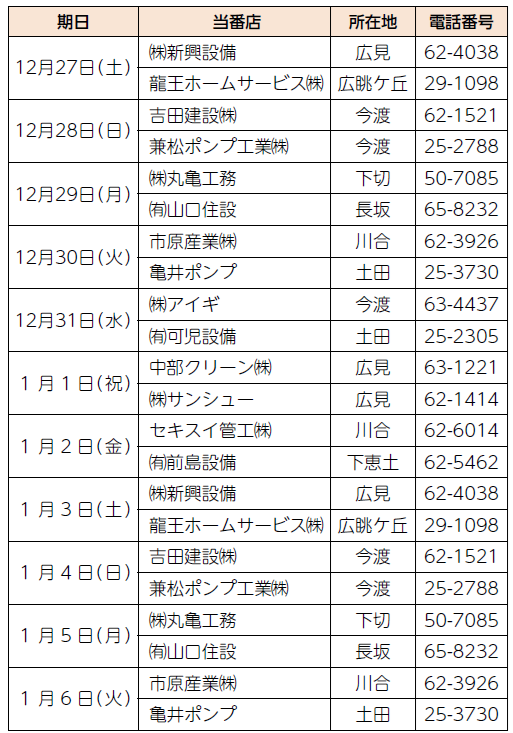 ▽年末年始の当番店(市の指定給水装置工事事業者)