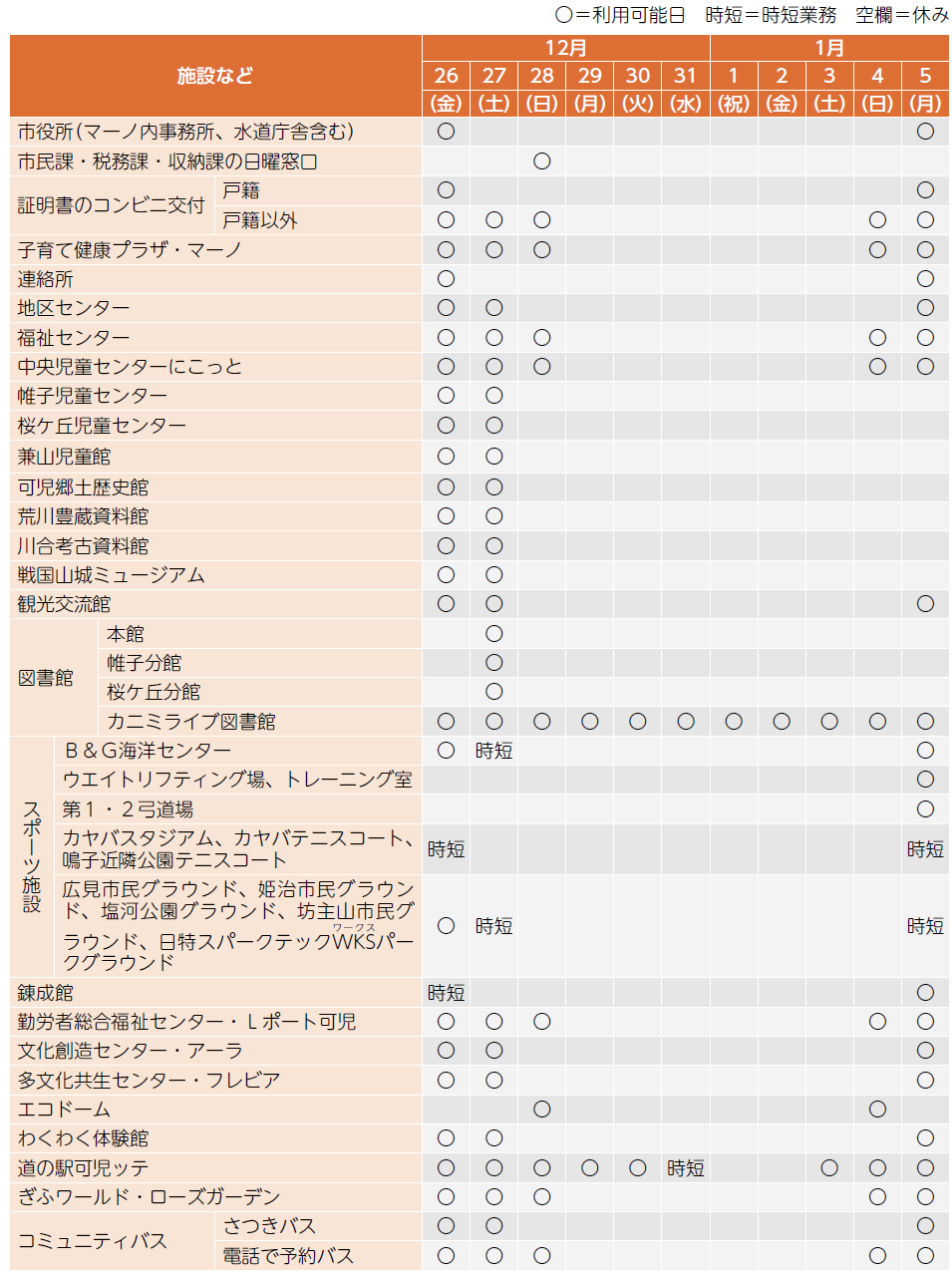 年末年始の市の施設などの利用可能日は次のとおりです。