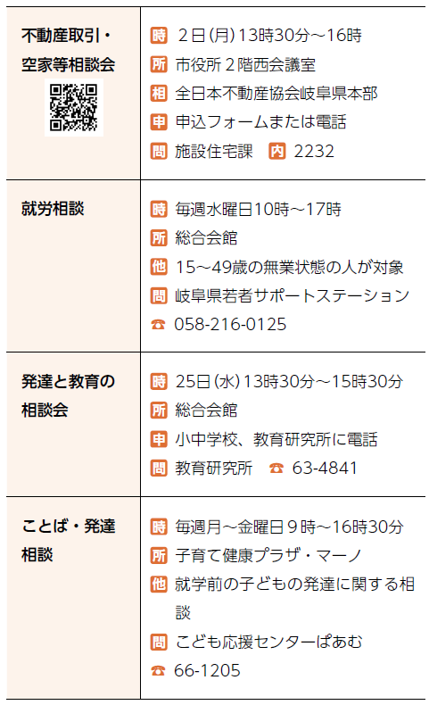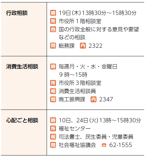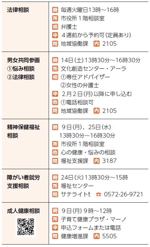 くらし 2月の無料相談 18/26 前の記事 次の記事 記事を読み上げる 発行日 : 2026年01月01日 自治体名 : 岐阜県可児市 広報紙名 : 広報かに 令和8年1月号 いずれの相談も祝日・振替休日・年末年始を除く ■申込が必要な相談 ■申込が不要な相談 先に相談者がいる場合、待ち時間が発生する可能性があります Tweet シェアする 定期開催の催し(2) 税金の納期限・不燃ごみ・リサイクル・日曜窓口・歯科休日当番医など
