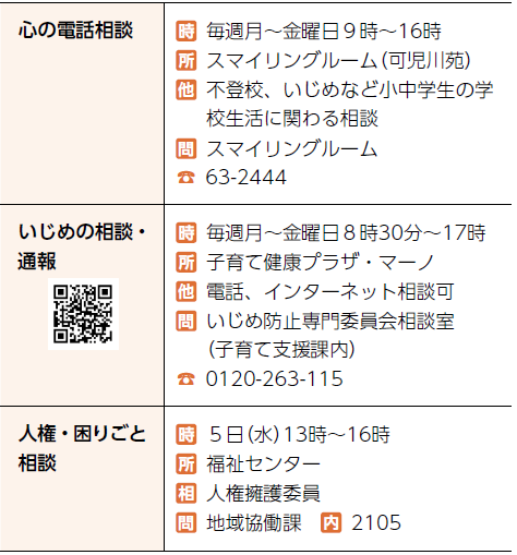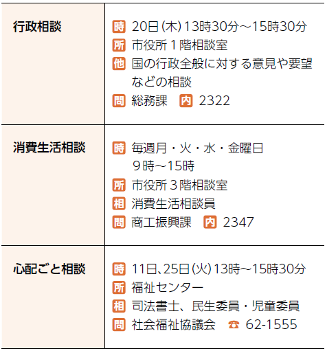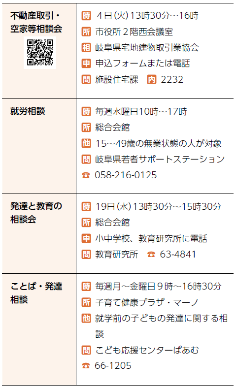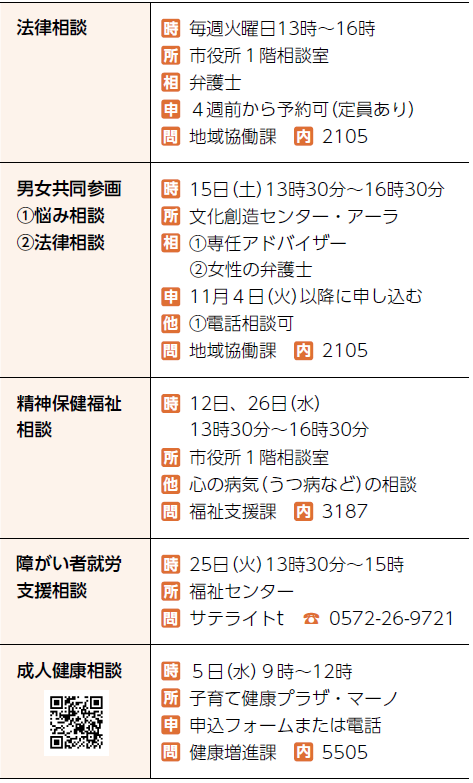 くらし 11月の無料相談 21/27 前の記事 次の記事 記事を読み上げる 発行日 : 2025年10月01日 自治体名 : 岐阜県可児市 広報紙名 : 広報かに 令和7年10月号 ※いずれの相談も祝日・振替休日・年末年始を除く ■申込が必要な相談 ■申込が不要な相談 先に相談者がいる場合、待ち時間が発生する可能性があります Tweet シェアする 定期開催の催し(2) 税金の納期限・不燃ごみ・リサイクル・日曜窓口・歯科休日当番医など