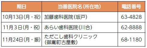 祝日・振替休日などに歯の急病で治療が必要な場合、ご利用ください。必ず電話してからお出かけください。