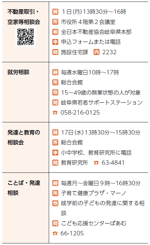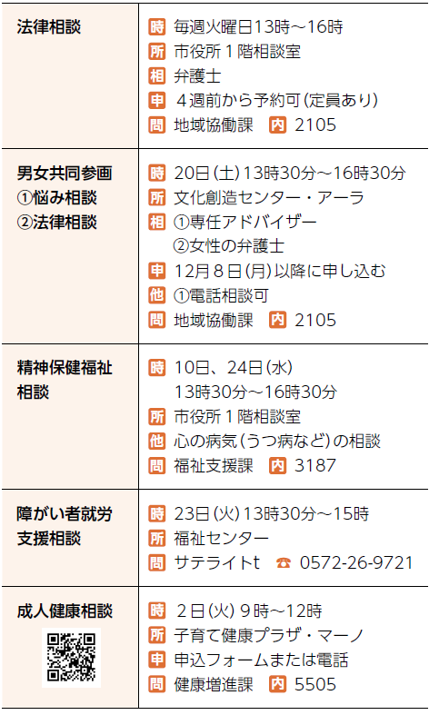 くらし 12月の無料相談 17/24 前の記事 次の記事 記事を読み上げる 発行日 : 2025年11月01日 自治体名 : 岐阜県可児市 広報紙名 : 広報かに 令和7年11月号 いずれの相談も祝日・振替休日・年末年始を除く ■申込が必要な相談 ■申込が不要な相談 先に相談者がいる場合、待ち時間が発生する可能性があります Tweet シェアする 定期開催の催し(2) 税金の納期限・不燃ごみ・リサイクル・日曜窓口・歯科休日当番医など