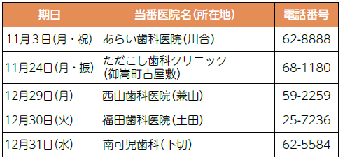 祝日・振替休日などに歯の急病で治療が必要な場合、ご利用ください。必ず電話してからお出かけください。
