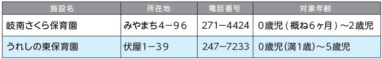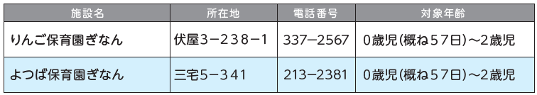 ・保育園と小規模保育園…保護者が会社勤務、内職・自営業に従事、病気・出産・看護などの理由で、保育が必要と認められる家庭のお子さん