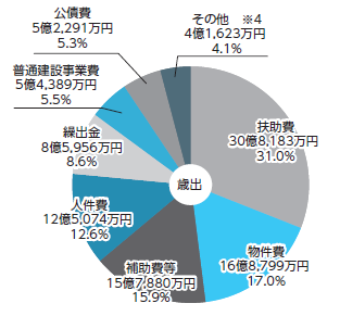 目的別で見ると、民生費が医療、介護、福祉など社会保障に係る経費の増加などにより、41億8,074万円(前年度比9.2%増)、総務費が定額減税補足給付金給付事業の実施により、14億1,841万円(前年度比35.9%増)と、前年度を大幅に上回りました。