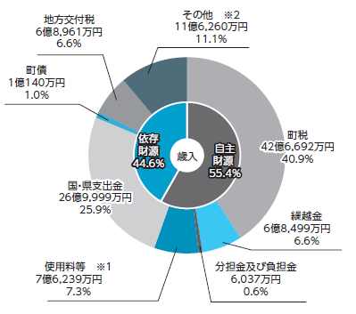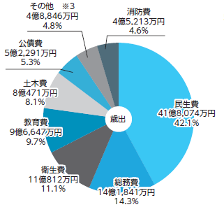 歳入は104億2,827万円(前年度比4.7%増)、歳出は99億4,195万円(前年度比7.2%増)となりました。