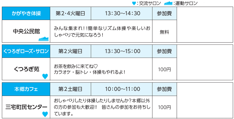 お茶を飲んでおしゃべりをしたり、軽い運動やレクリエーションなどをしていきます。気軽にご参加ください。