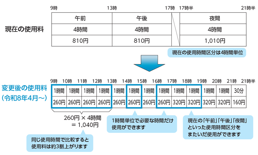 また、一部施設については、利便性向上のため使用時間区分を1時間単位に変更します。