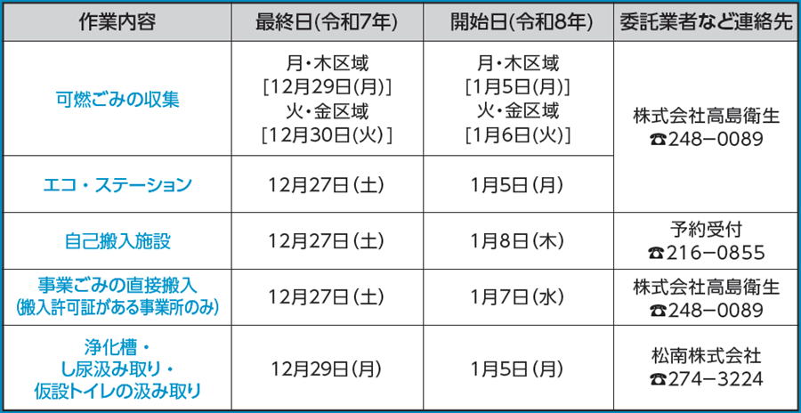 ◆年末年始のごみ収集・し尿汲み取りなどの予定表