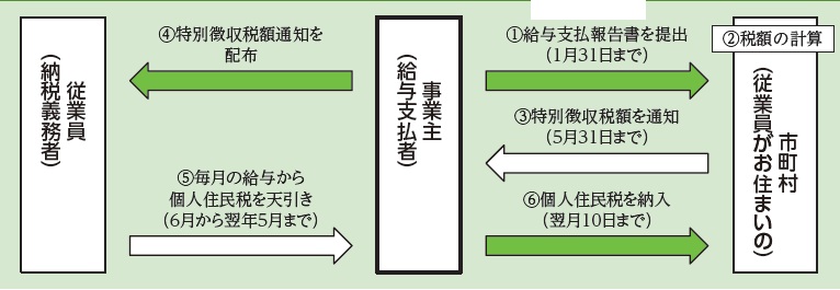 事業主(給与支払者)が従業員(納税義務者)に代わり、所得税の源泉徴収と同様に、毎月従業員の方に支払う給与から個人住民税を天引きし、納入していただく制度です。