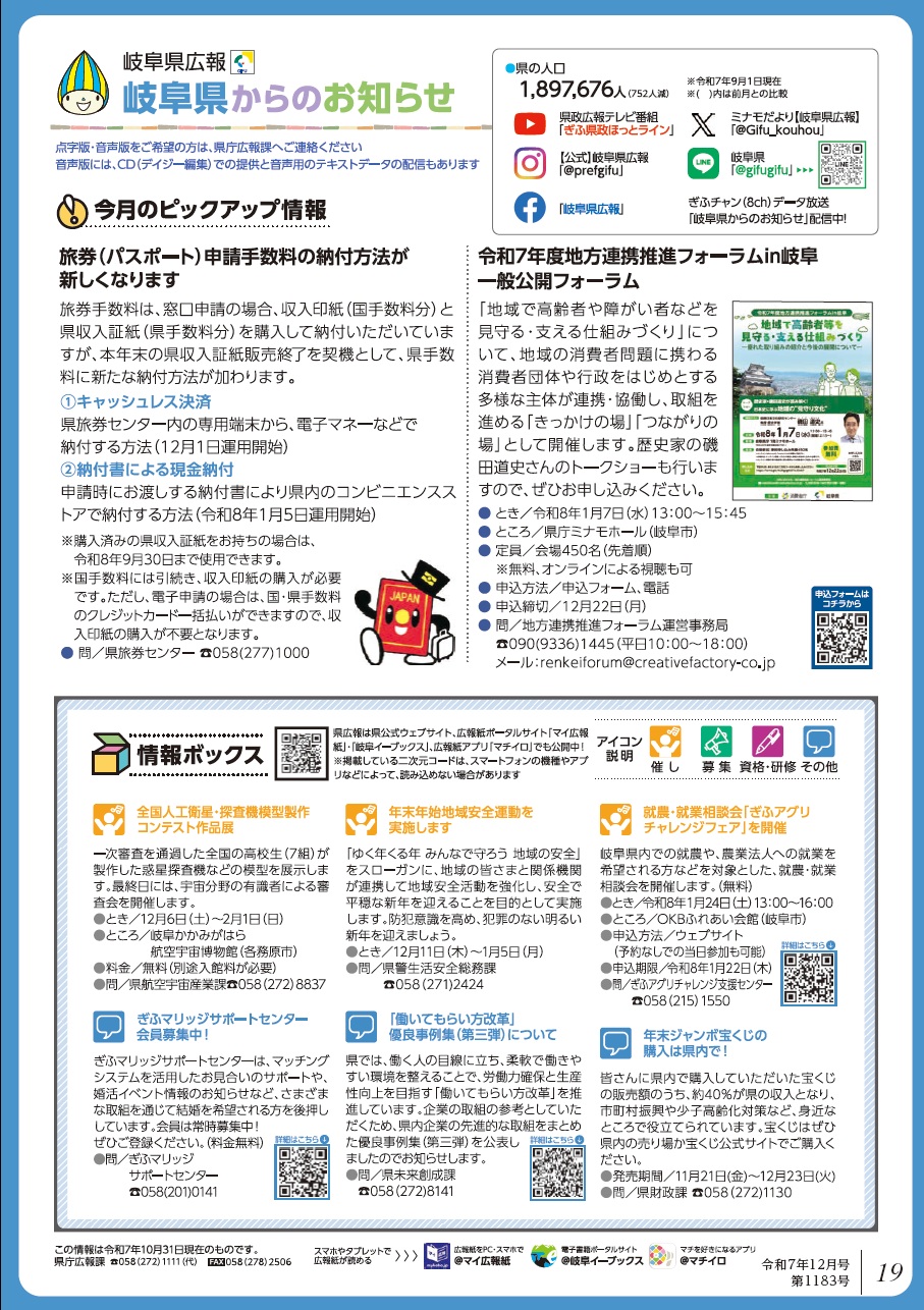 くらし 岐阜県からのお知らせ 32/35 前の記事 次の記事 発行日 : 2025年12月01日 自治体名 : 岐阜県笠松町 広報紙名 : 広報かさまつ (令和7年12月号) Tweet シェアする 今月の納税納付期限は1月5日(月)です かさまつサイクルパーク2025を開催しました!