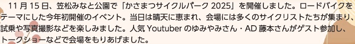 イベント かさまつサイクルパーク2025を開催しました! 33/35 前の記事 次の記事 発行日 : 2025年12月01日 自治体名 : 岐阜県笠松町 広報紙名 : 広報かさまつ (令和7年12月号) Tweet シェアする 岐阜県からのお知らせ Hello!こんにちは