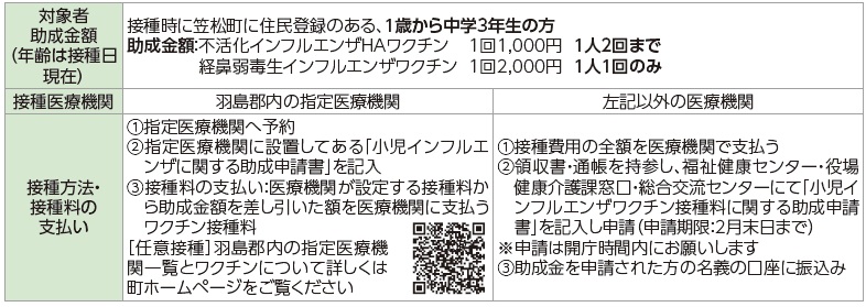 健康 季節性インフルエンザの予防接種 29/45 前の記事 次の記事 発行日 : 2025年10月01日 自治体名 : 岐阜県笠松町 広報紙名 : 広報かさまつ (令和7年10月号) 接種期間:10月1日(水)~令和8年1月31日(土)(医療機関の診療時間内) (1)定期接種(65歳以上の高齢者) (2)任意接種(1歳から中学生) Tweet シェアする 10月の健康だより-こども家庭センター- 新型コロナワクチン予防接種