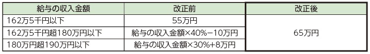 給与収入金額が190万円以下の方の給与所得控除額が65万円に引き上げられます。
