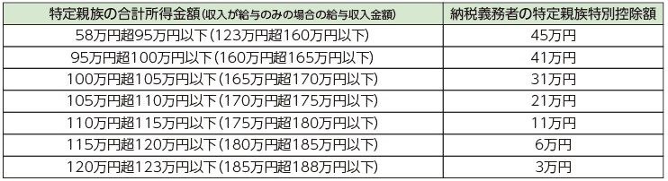 大学生などの就業調整に対応するため、納税義務者と生計を一にする19歳以上23歳未満の親族で前年の合計所得金額が58万円超123万円以下(特定親族)の場合、合計所得金額に応じて、納税義務者が控除を受けられる仕組みが新たに導入されます。