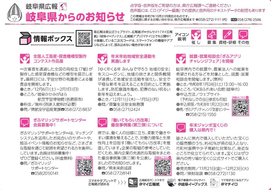 くらし 岐阜県からのお知らせ 43/54 前の記事 次の記事 発行日 : 2025年12月01日 自治体名 : 岐阜県養老町 広報紙名 : 広報養老 2025年12月号 Tweet シェアする 8020よい歯の高齢者表彰 養老公園からのお知らせ