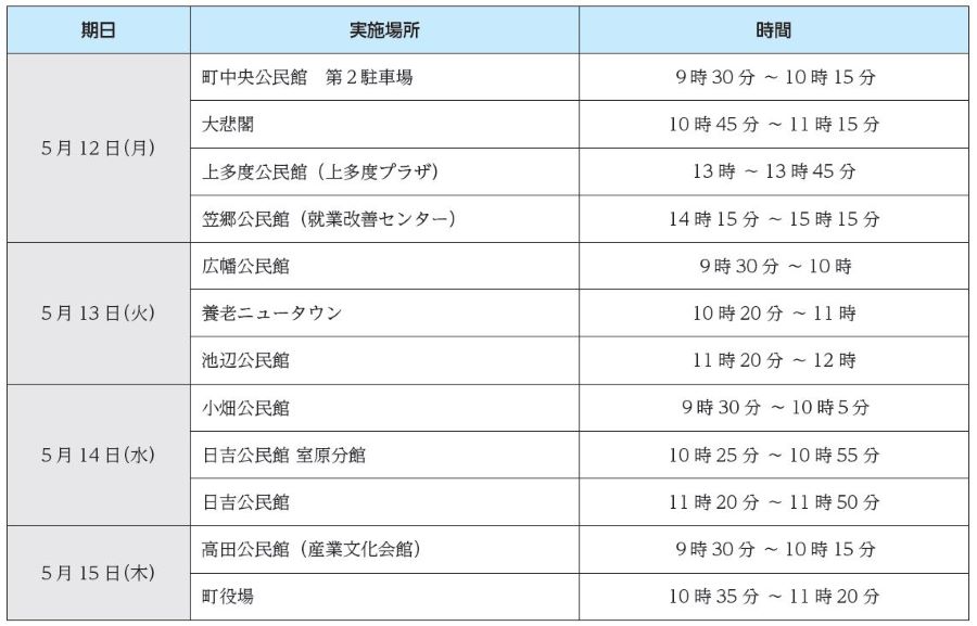町では、令和7年度の狂犬病予防集合注射を次の日程表のとおり実施しますので、犬を飼っている人は最寄りの会場で飼い犬への予防注射を受けてください。