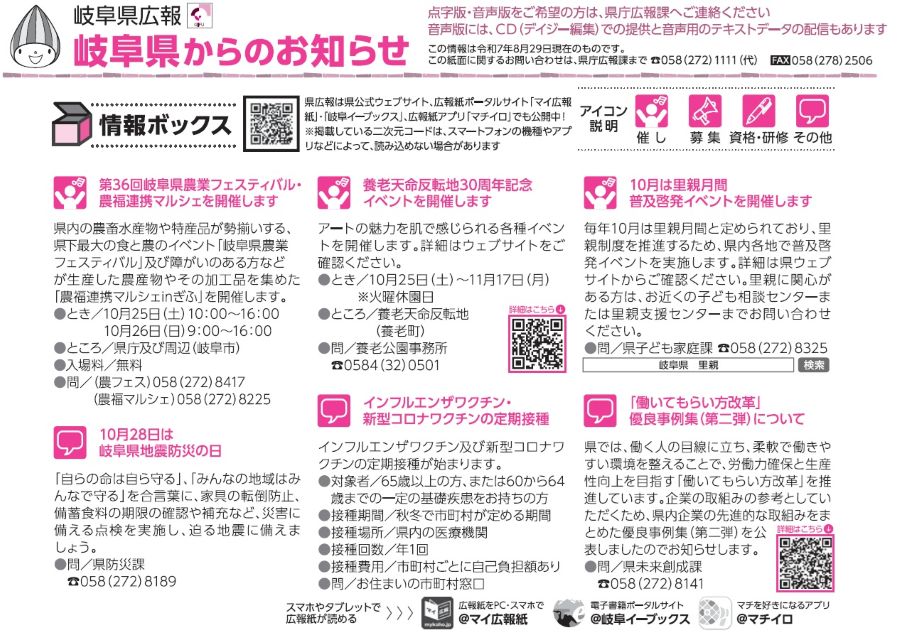 くらし 岐阜県からのお知らせ 43/53 前の記事 次の記事 発行日 : 2025年10月01日 自治体名 : 岐阜県養老町 広報紙名 : 広報養老 2025年10月号 Tweet シェアする 認知症カフェに参加してみませんか 養老公園からのお知らせ