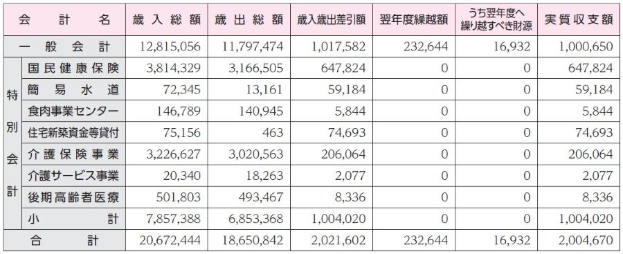 一般会計の決算は、歳入128億1,505万6千円、歳出117億9,747万4千円となり、前年度に比べ、歳入が3億2,900万3千円の減、歳出が3億3,873万6千円の減となりました。また、特別会計の決算の合計は、歳入78億5,738万8千円、歳出68億5,336万8千円で、前年度に比べ、歳入が1,953万円の減、歳出が5,601万3千円の増となりました。
