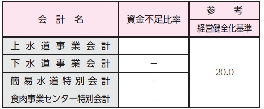 資金不足比率:上水道や下水道などの公営企業の資金不足を、料金収入などの規模と比較して指標化し、経営状態の悪化の度合いを示すもの。