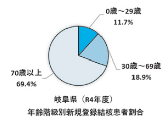岐阜県でも、新規結核患者の約7割が70歳以上の高齢者です。早期発見のために年に一度は結核健診を受けましょう!
