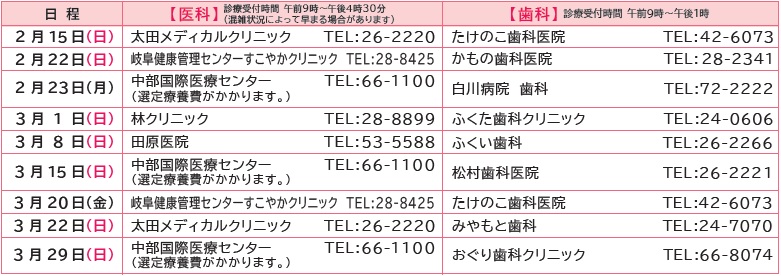※途中休憩がありますので、各医療機関に電話でご確認のうえお出かけください。