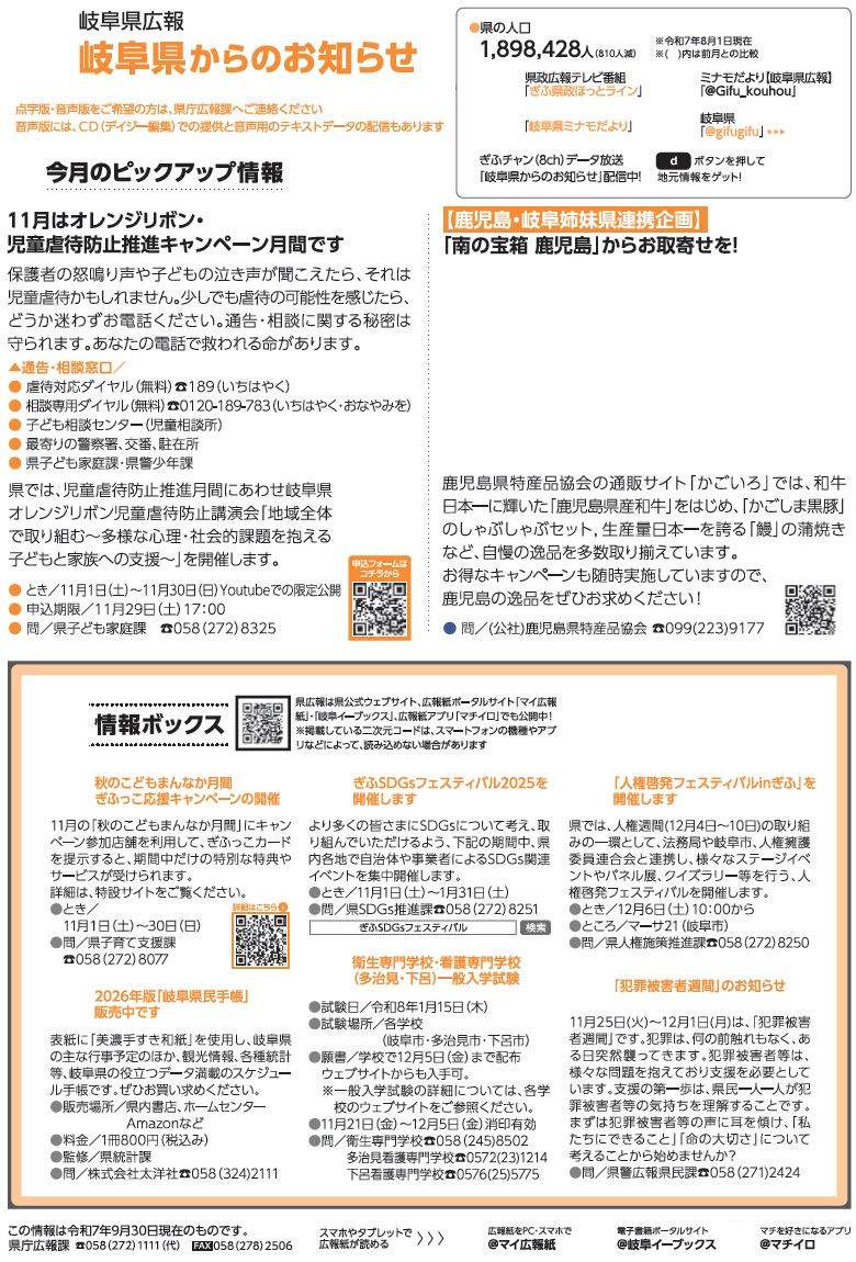 イベント 岐阜県広報 岐阜県からのお知らせ 15/17 前の記事 次の記事 発行日 : 2025年10月15日 自治体名 : 岐阜県坂祝町 広報紙名 : 広報さかほぎ 2025年10月号 Tweet シェアする 町リサイクルステーションの収集日 つどいの広場 アンブレラ